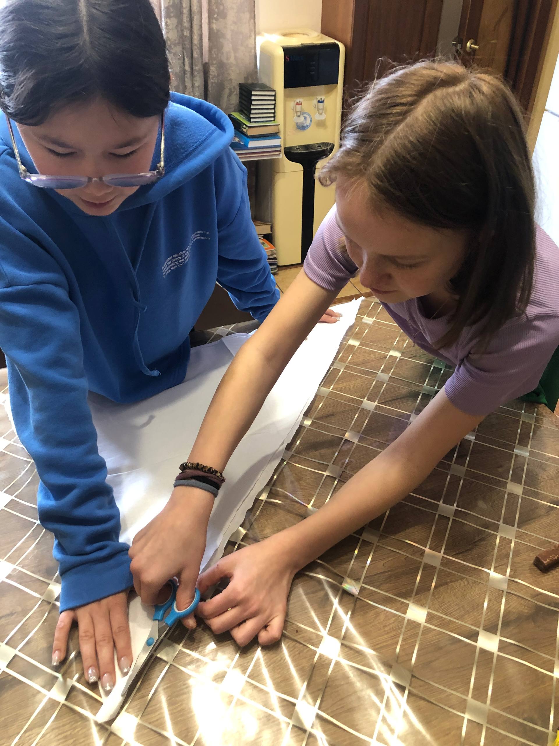 Для Алины и Вики это первый опыт, но они справляются с большим старанием: учатся ровно кроить ткань, аккуратно работать с ножницами и, что особенно важно, помогать друг другу.